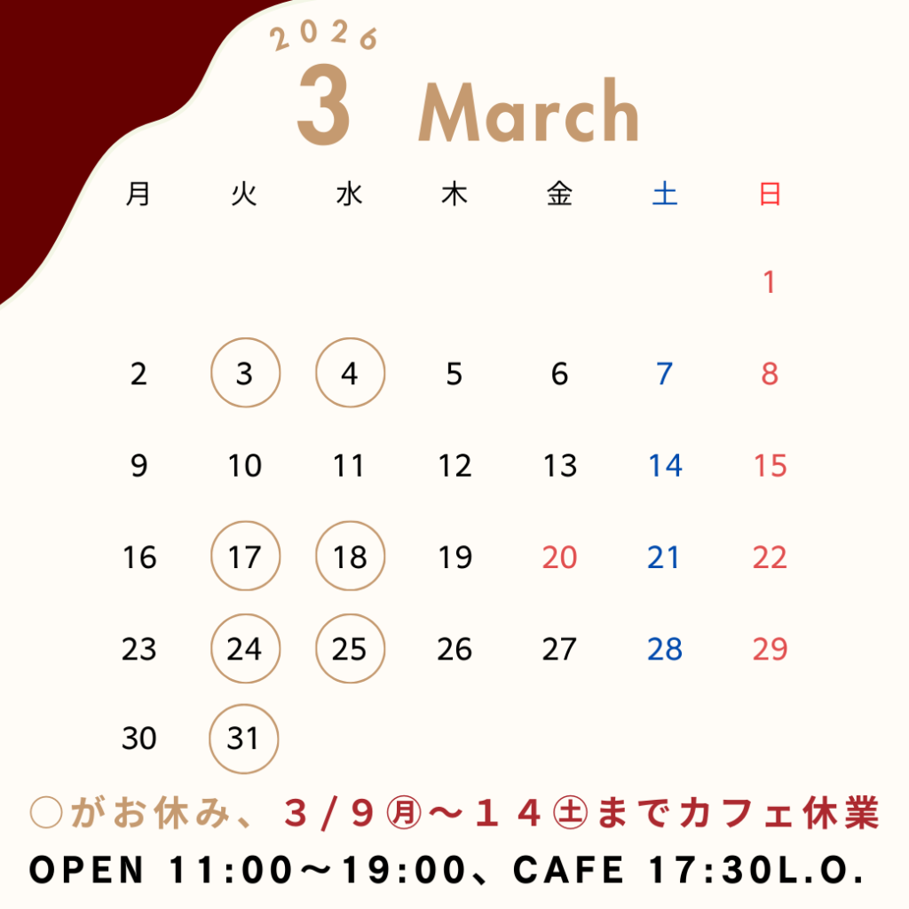 カフェスペースは3月9日(月)~14日(土)まで休業させていただきます。
