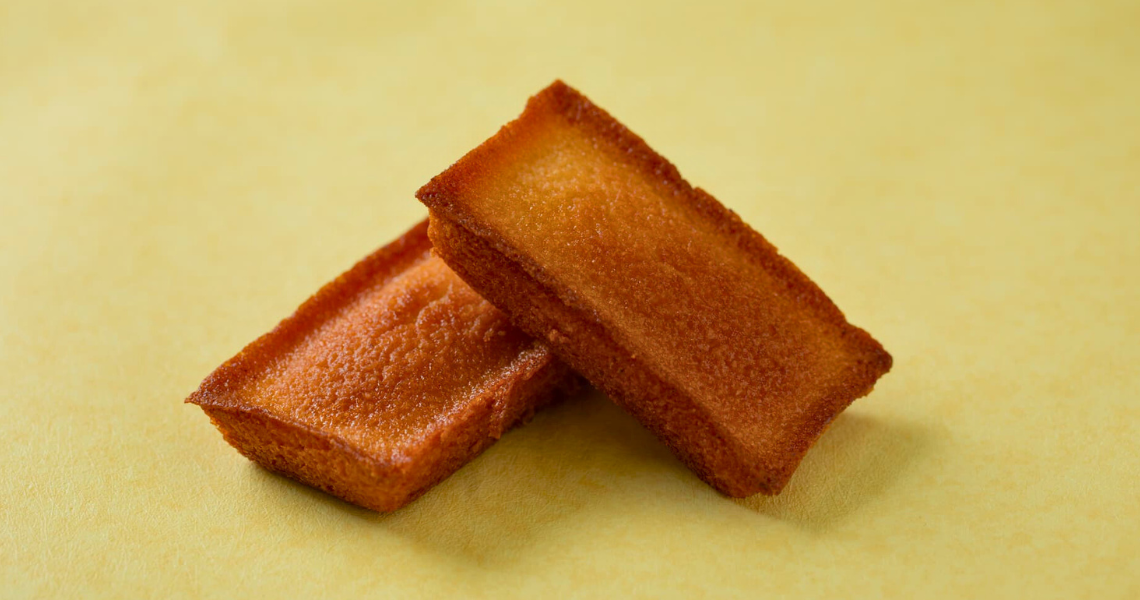 間渕商店創業330周年記念商品。静岡県浜松市の老舗酒造会社「花の舞酒造」の酒粕、カカオ37%のホワイトチョコレートを使ったフィナンシェです。口に入れた途端、酒粕の香りが広がります。